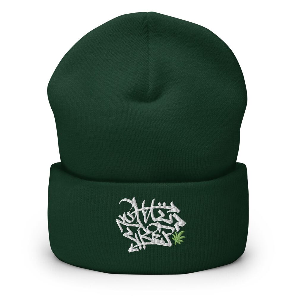 "What Trip?"の大胆なタギングを繊細な刺繍で表現し、リーフのグリーンがアクセントになっている。様々なスタイルでも活躍できるベーシックなニット帽に仕上がっている。